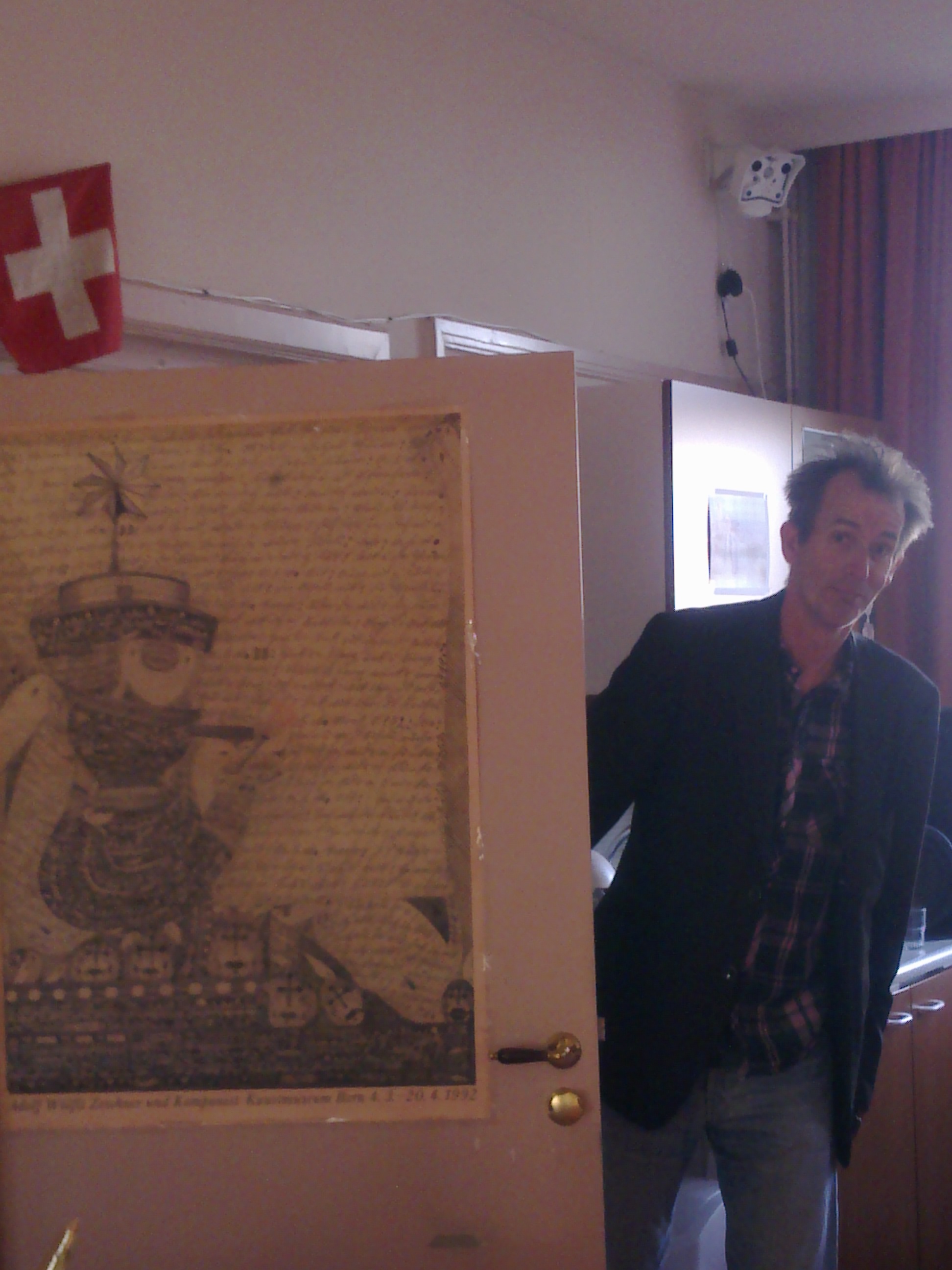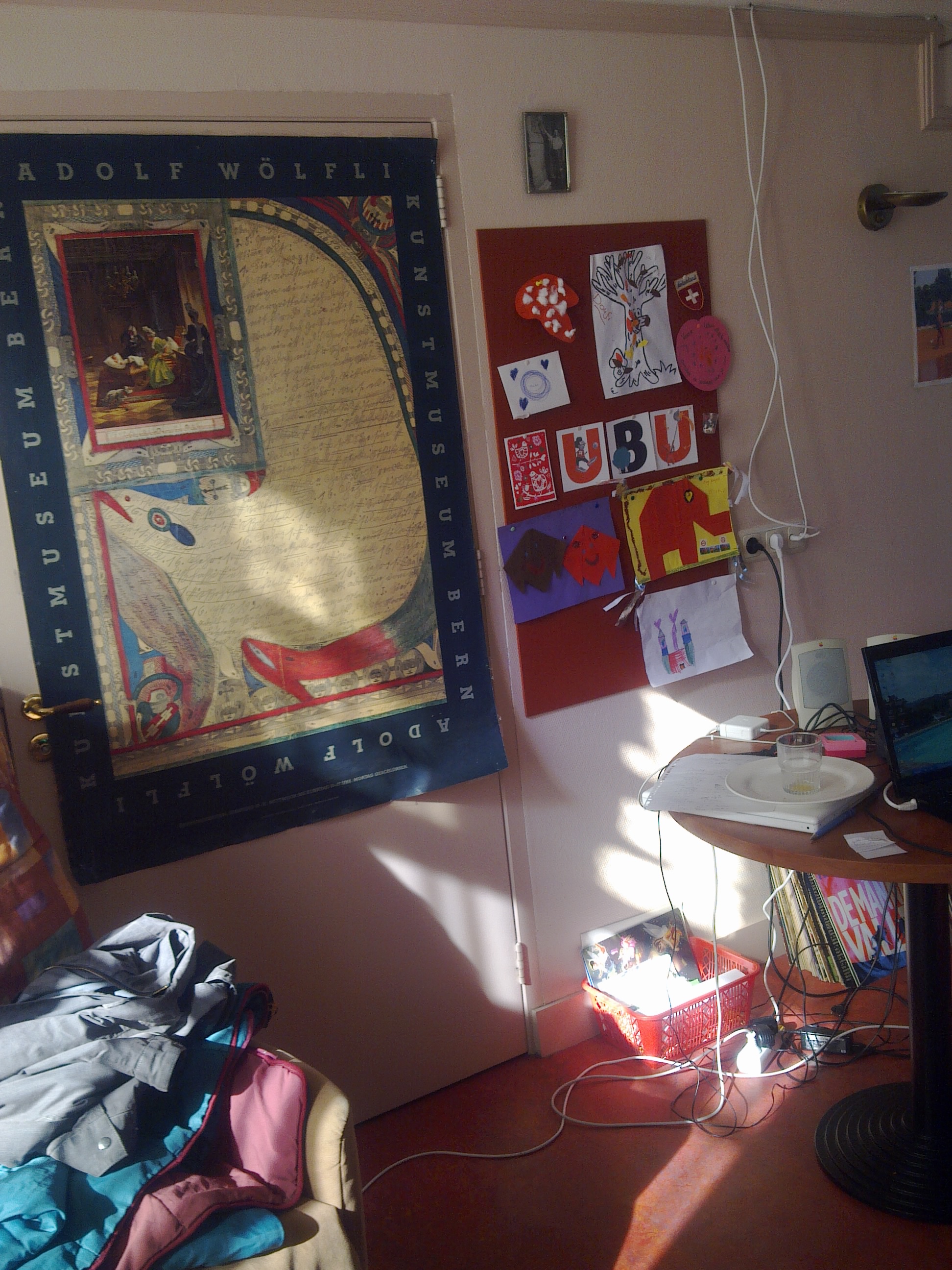Kijk, Ubu’s kamer. De muren en deuren hangen vol met posters en foto’s die hij graag ziet. Kunst van Wölfli, kunst van Miki, foto’s van zijn gezin, van mooie mensen en herinneringen. De Zwitserse vlag.
